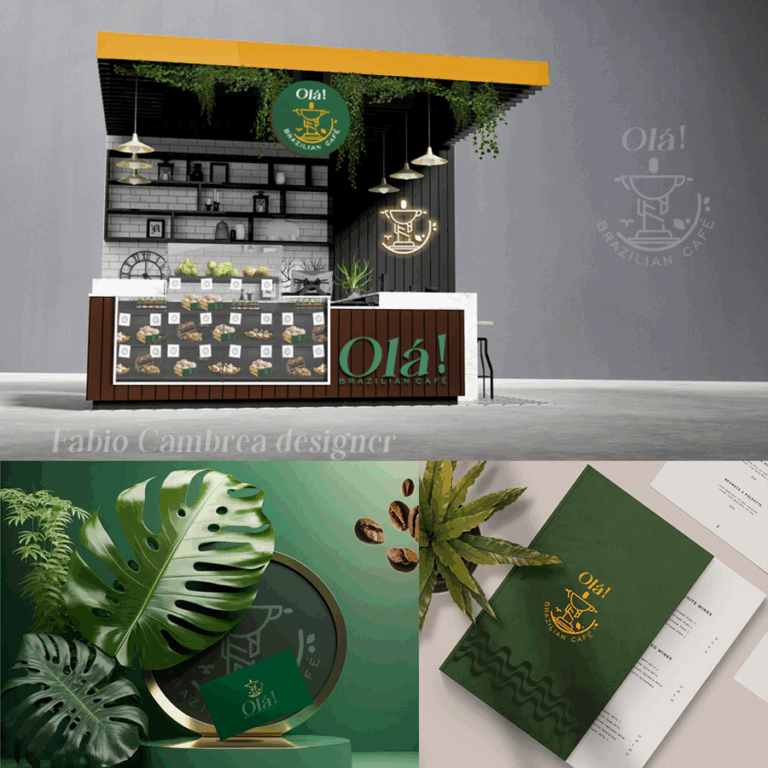 Nosso conceito é inspirado em ícones brasileiros famosos, como o Rio de Janeiro, com a abundância de cores verdes e tonalidades de amarelo. A principal referência desse projeto foi o conceito da cultura brasileira no ambiente do coffee shop, resgatar o sentimento de estar em casa, criar uma comunicação que se conecte com o país de origem, onde a marca busca oferecer produtos e serviços de qualidade e de fácil comunicação com o cliente, portanto escolhemos a figura do Cristo Redentor, sendo seu corpo formado por uma xícara de café e formas que representam os grãos e folhas.